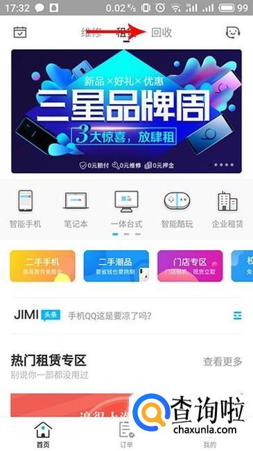 以“机蜜”这个软件为例,在应用市场进行下载安装之后进入,在首页上方点击“回收”