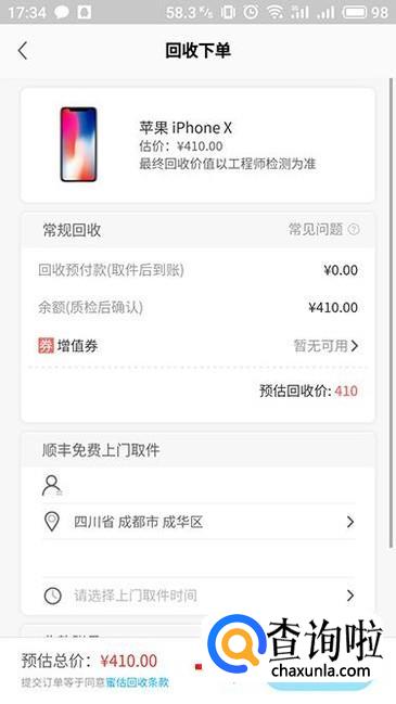 点击立即回收之后进行回收下单界面,再次确定相关回收信息,填写上门收件地址,然后选择“提交订单”就可以了。