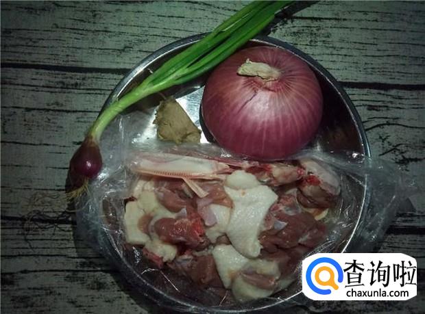 准备好所有材料:鸭肉,买了半边普通家鸭、洋葱一个、葱一根、姜适量。