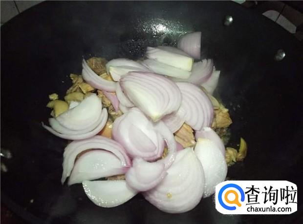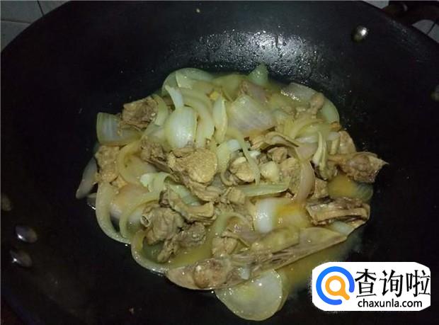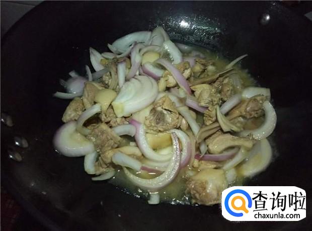 等鸭肉的均匀上色后,加入洋葱,把洋葱翻炒均匀。