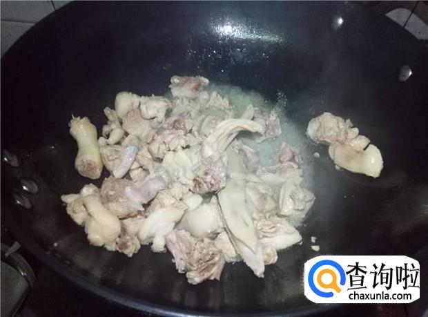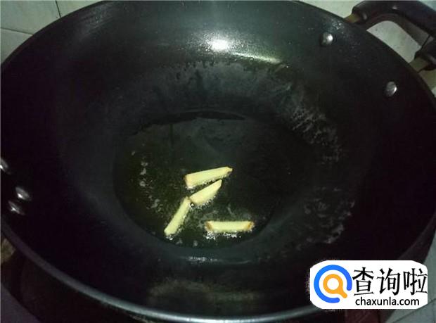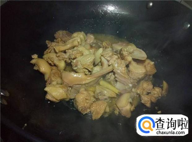 热锅下油,放入姜片煸香,然后倒入鸭肉翻炒。