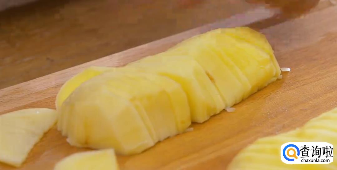 土豆切厚片,下冷水泡,去除多余淀粉,洗净控干。