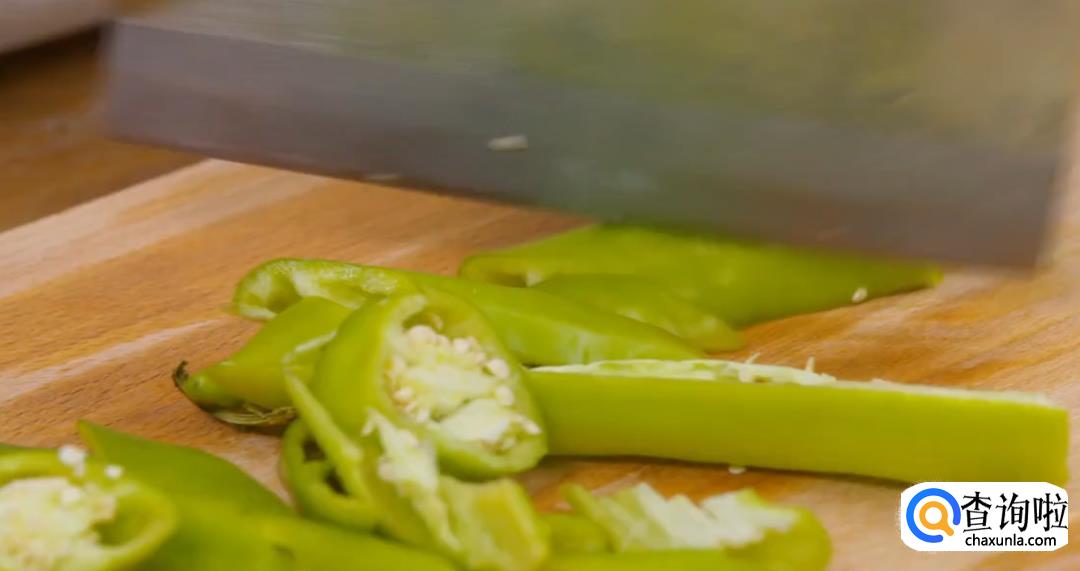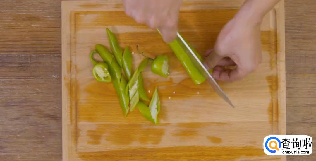 青椒对半剖开,切片。茄子去蒂,滚刀切块。