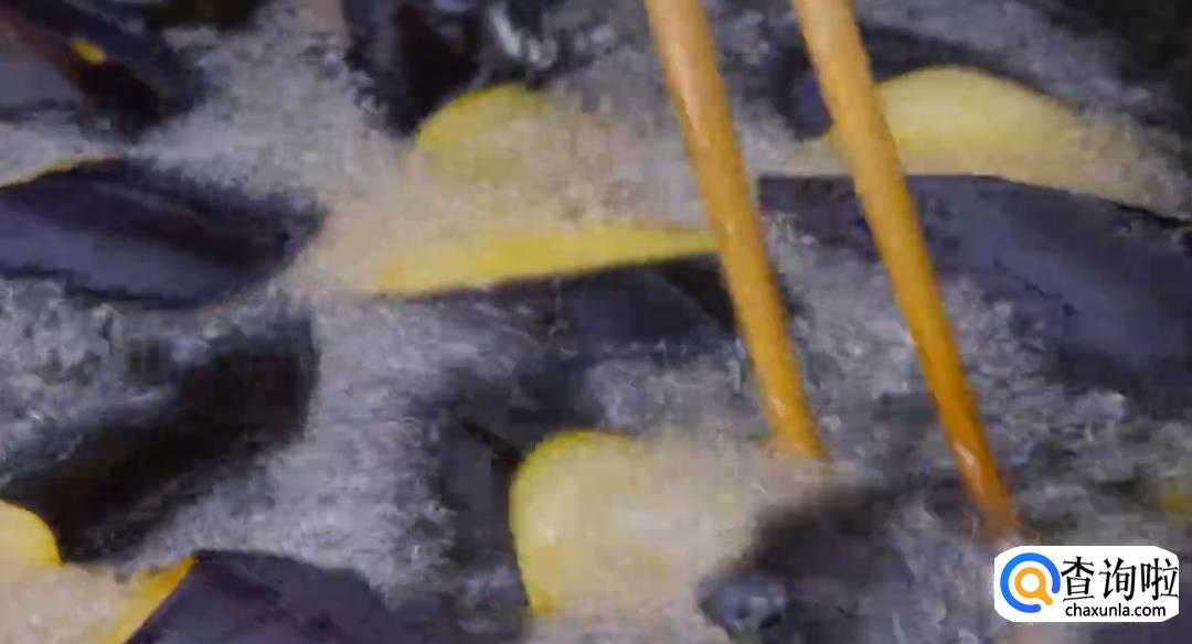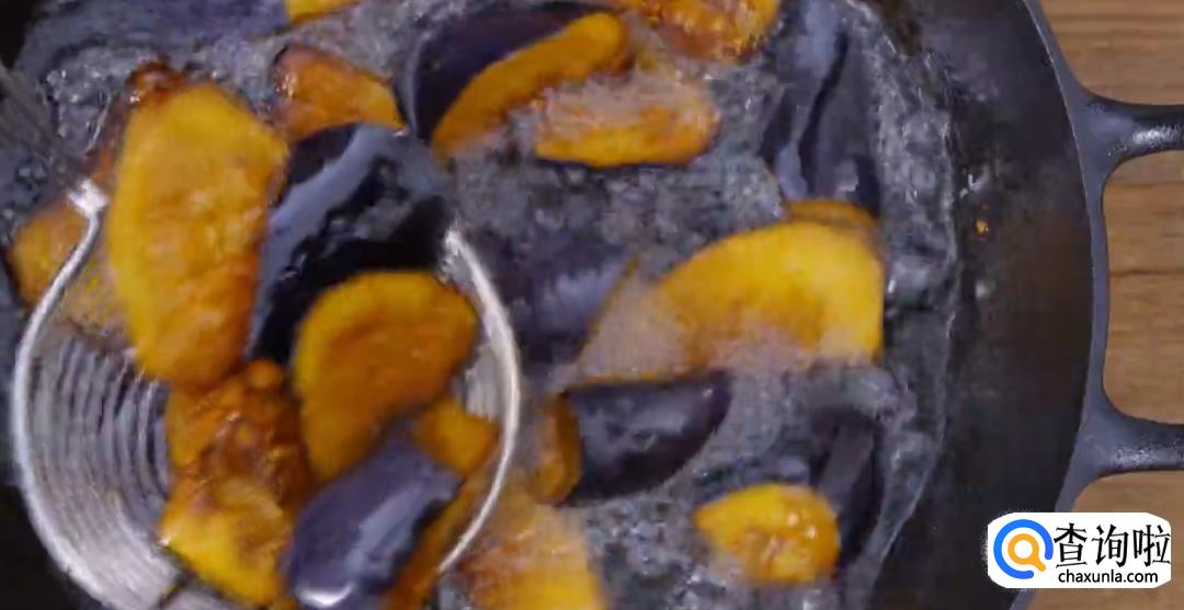 3、炸茄子的油温一定要高,这样茄子表面才会焦糊,不至于吃太多油。