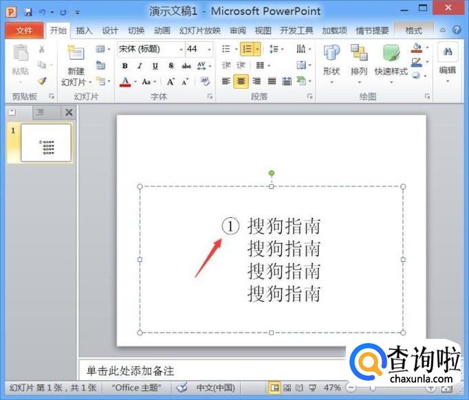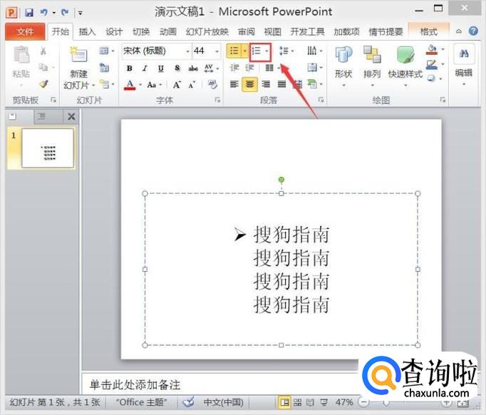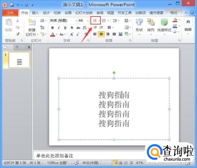 打开PPT之后在编辑区里输入文字,然后在开始里找到项目符号选项,如图所示: