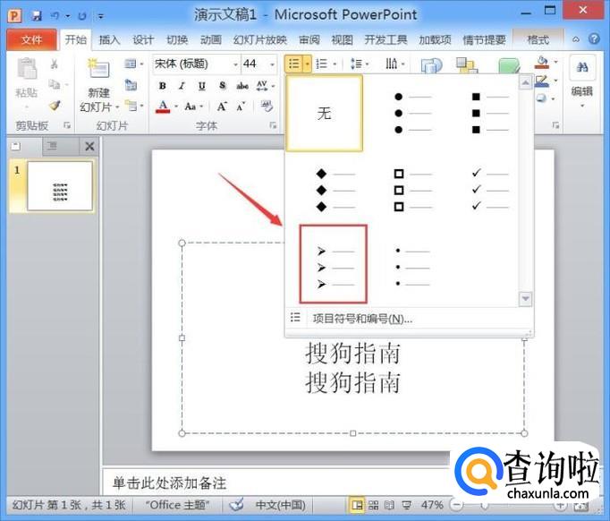 点击项目符号的下拉箭头在其下拉菜单里选择一种项目符号,如图所示: