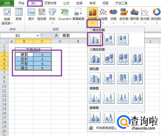 我们点击选中图示中的区域,然后点击插入,点击柱形图中的下拉箭头,然后选择二维柱形图;