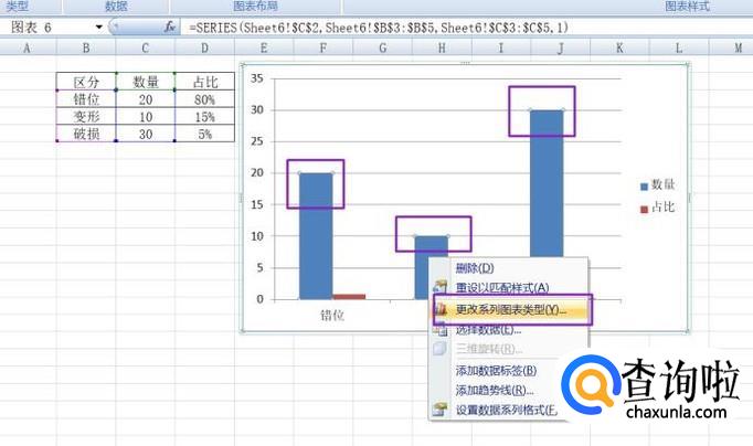 弹出的界面,我们选择图示中的柱形,然后右击选择更改系列图表类型;