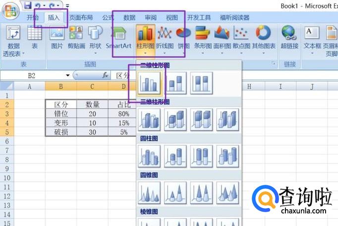 之后我们点击插入,点击柱形图,点击二维柱形图;