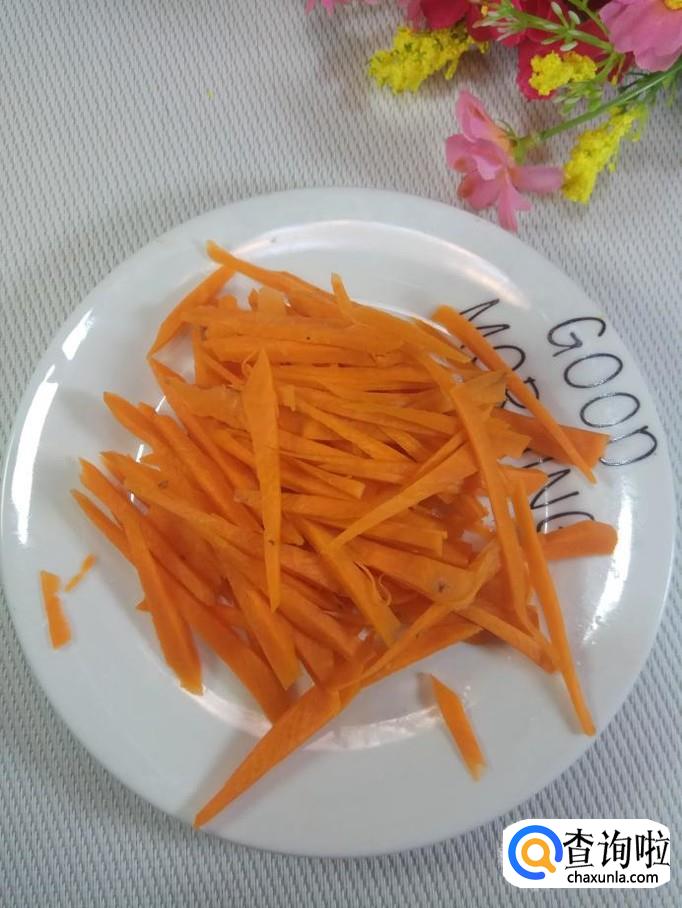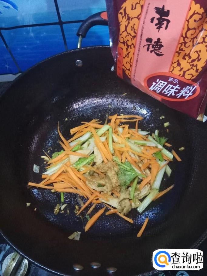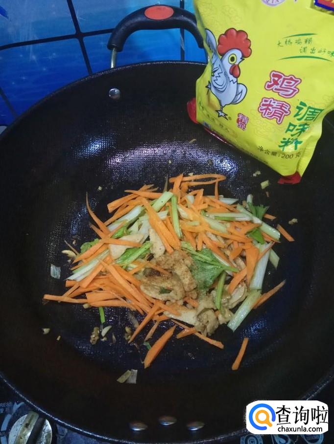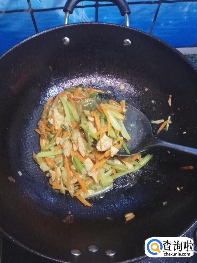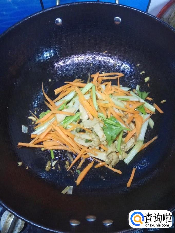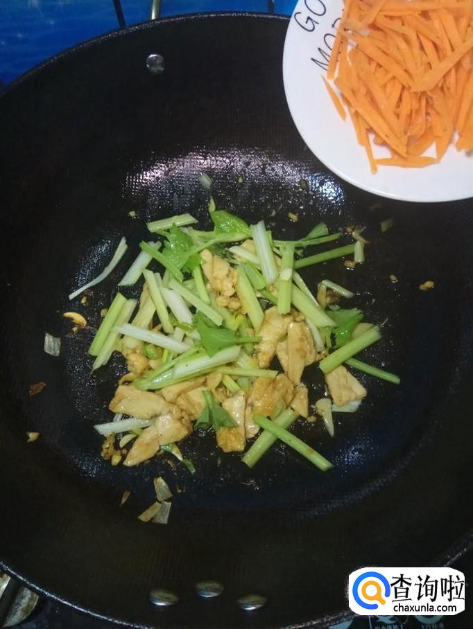 将准备好的胡萝卜粗丝也倒入锅中,和芹菜,鸡脯肉一起翻炒一下。