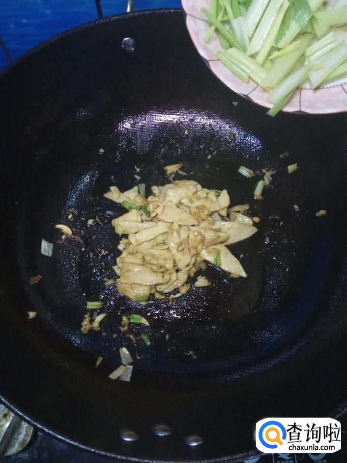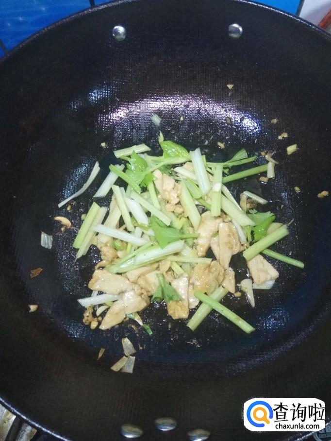 将准备好的芹菜段放入锅中,和鸡脯肉一起翻炒均匀。
