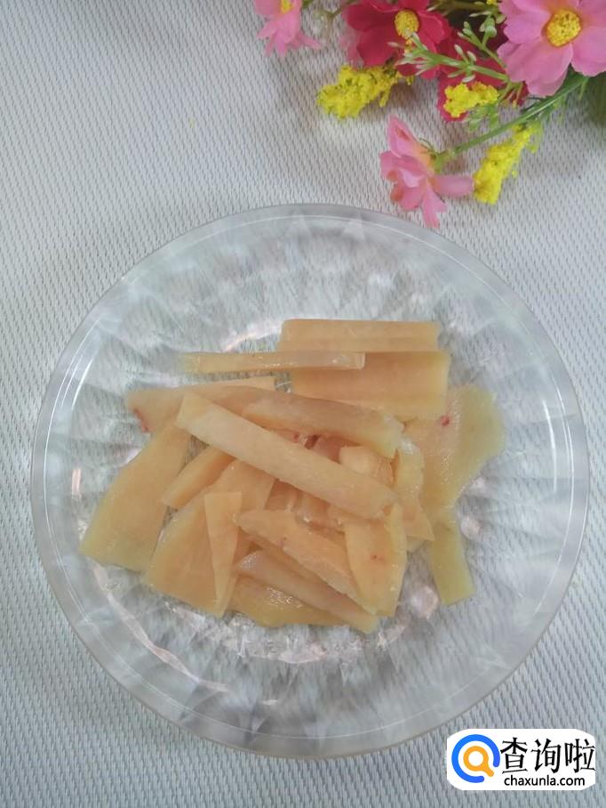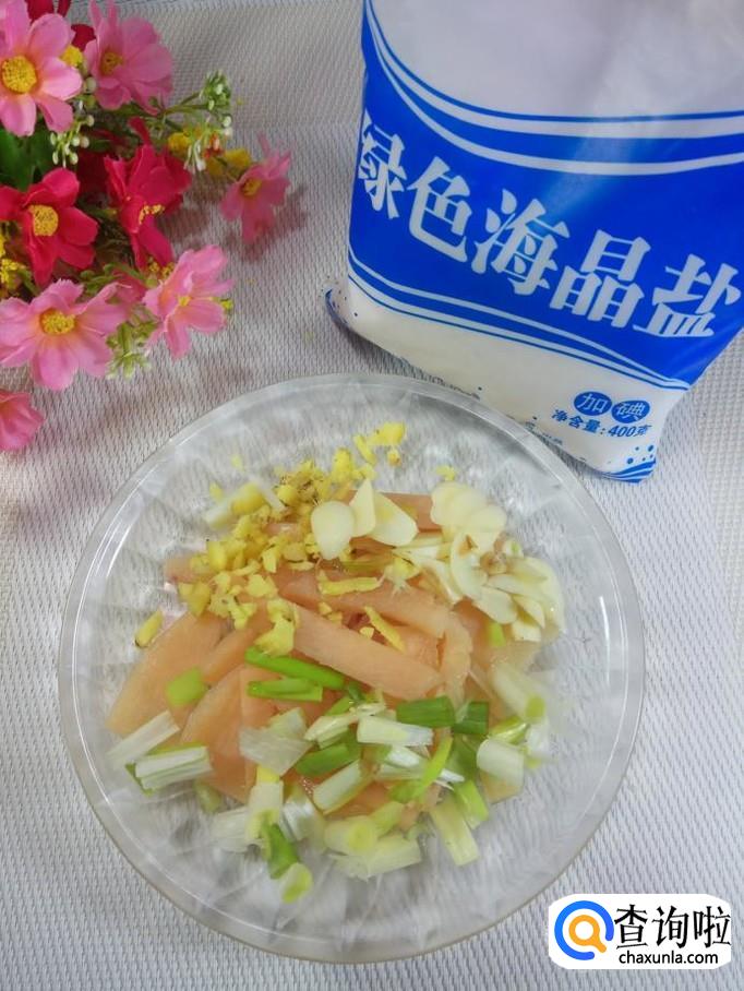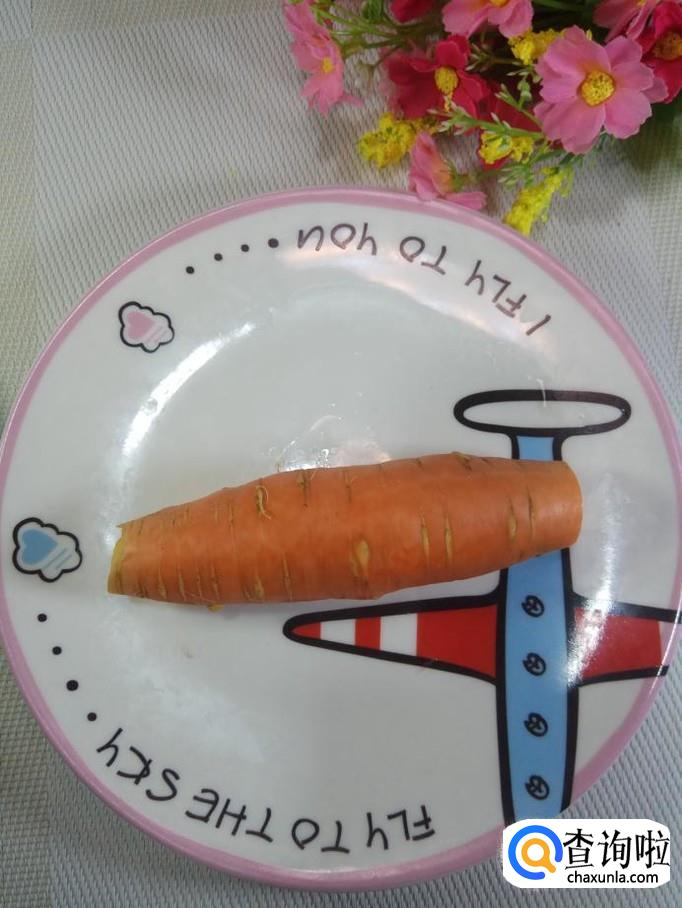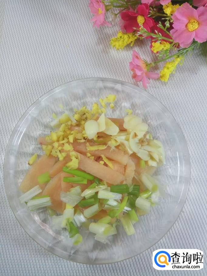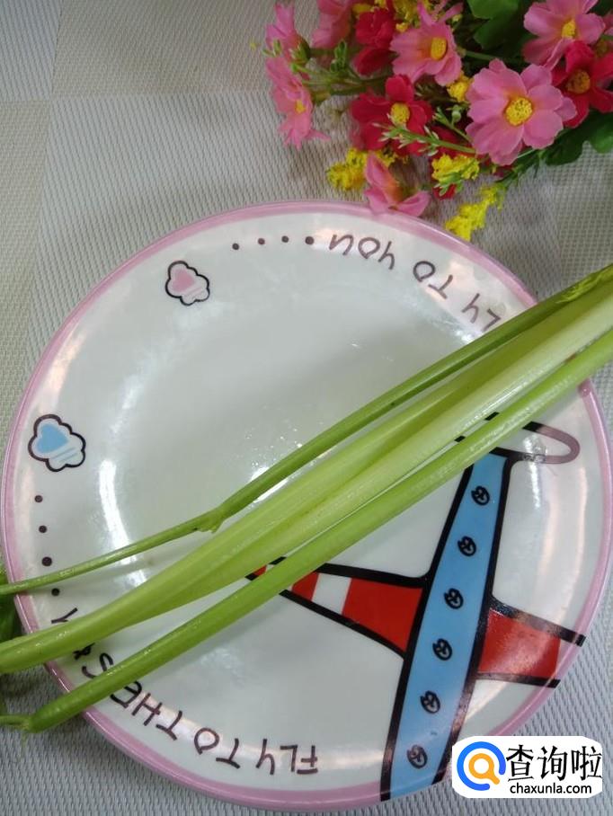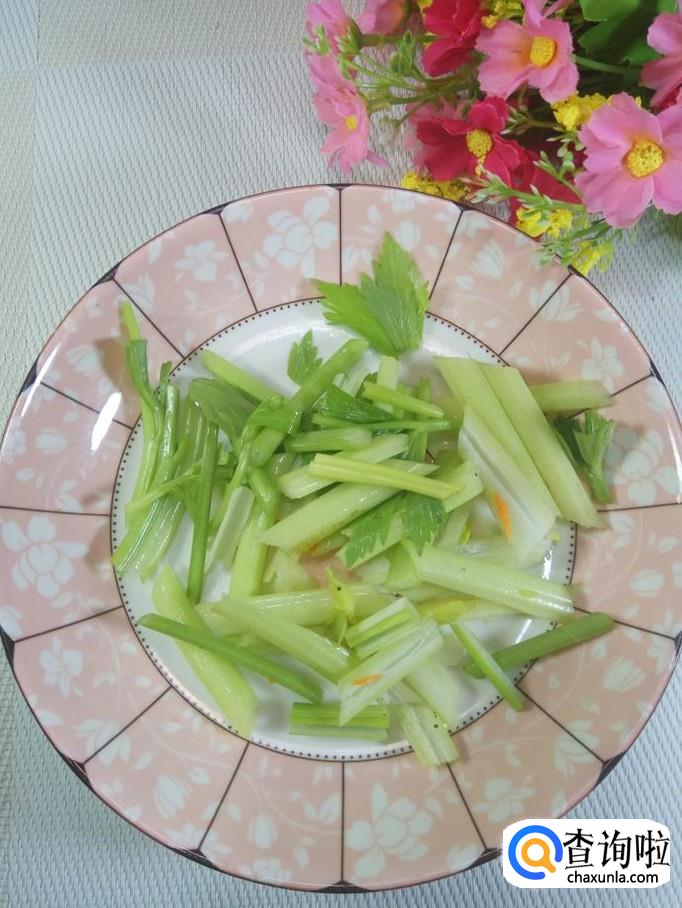 准备适量芹菜,洗净后摘去叶子,放入盘中备用;准备一个胡萝卜,洗净备用;再准备适量鸡脯肉,清水中加少许食盐,将鸡脯肉泡十分钟左右,洗净备用。