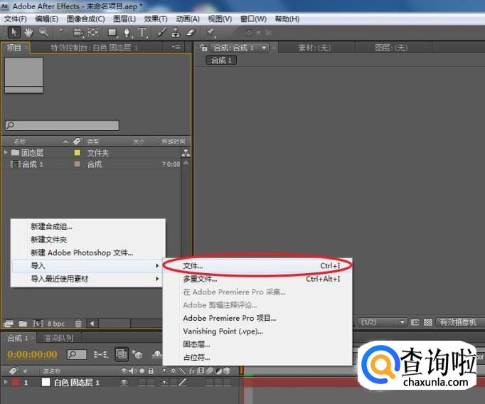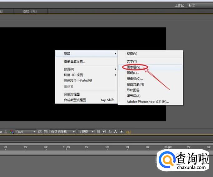 在合成窗口的空白区域,右键鼠标,依次执行:“新建>固态层”,建立一个新的固态层。