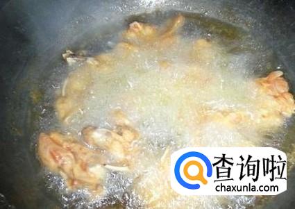 锅装适量的油,油温热到80度左右,把粘满面粉的鸡叉放进去炸,炸到半黄色捞上来。