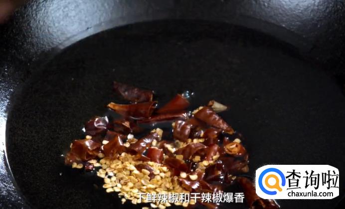 热锅起油,下干辣椒和鲜辣椒爆香。