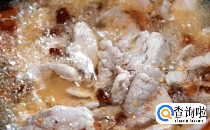 放入里脊肉片煸炒,并加入少许老抽上色。