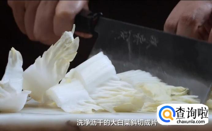 洗净沥干的大白菜斜切成片,菜梗和菜叶分开放。