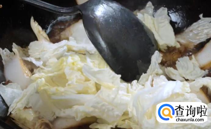接着放花椒提香,加入白菜梗翻炒至稍软,再下菜叶炒至断生。