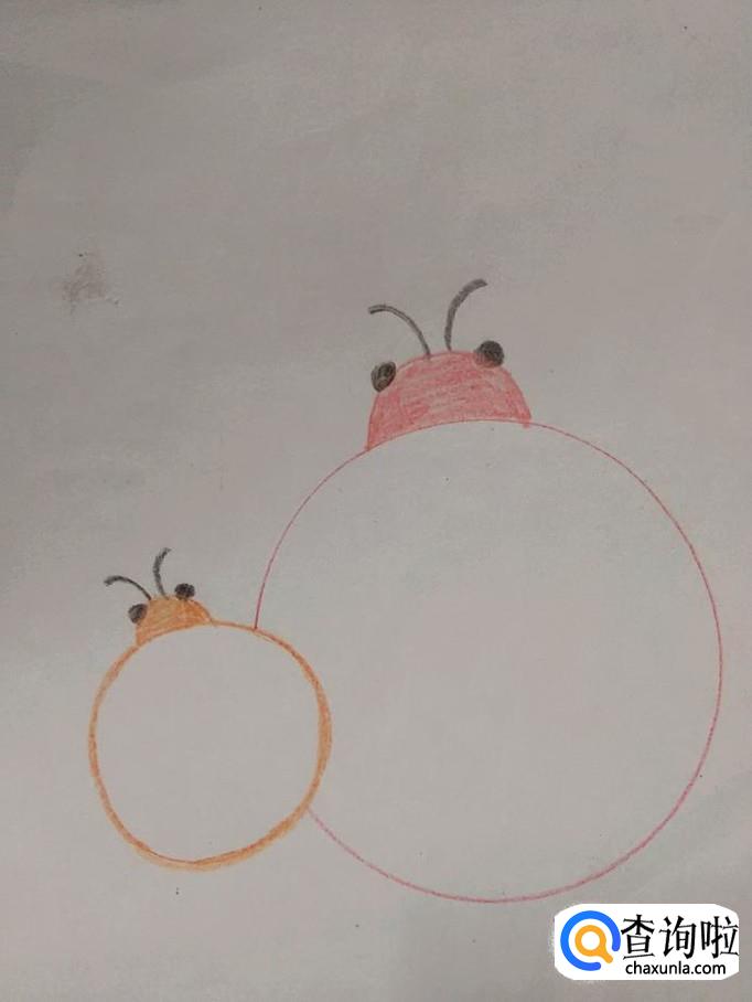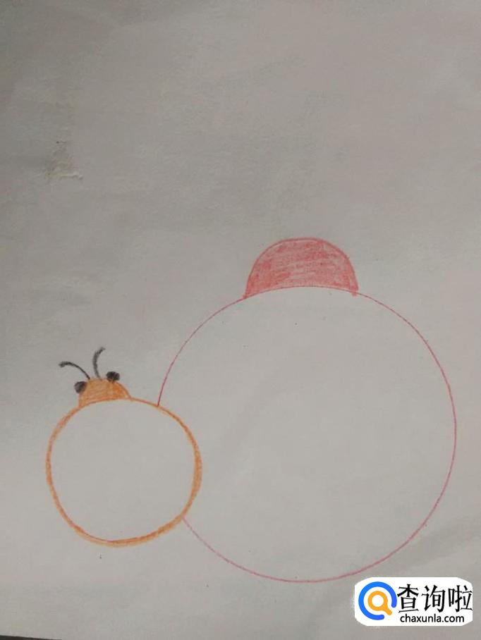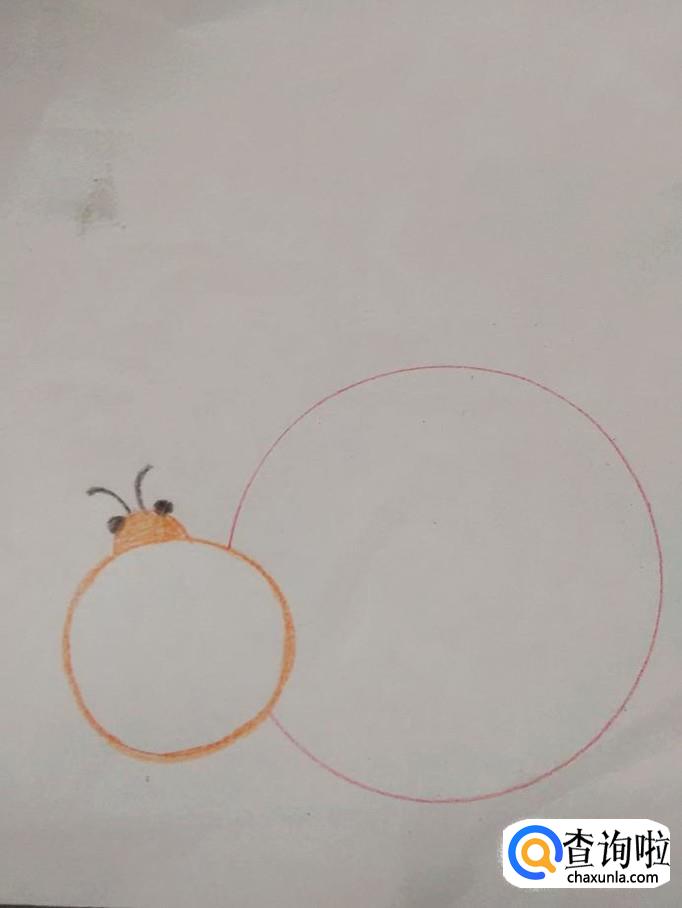 用红笔在小瓢虫右侧画一个大的圆形,表示瓢虫妈妈的背。