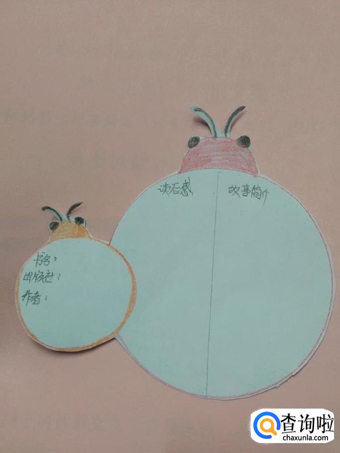 用剪刀将两只瓢虫剪下来,读书卡就做好了,当你读完一本书时,把详细资料和感想写在读书卡上相应的地方,保存起来,特别有意义。