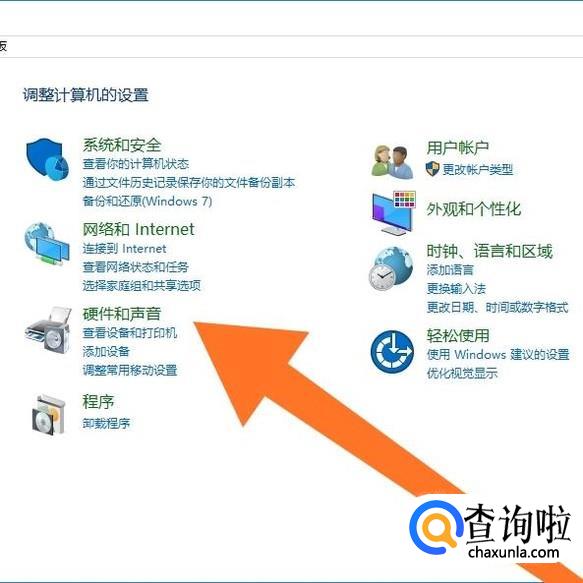 进入到控制面板后,接着点击进入“硬件和声音”。