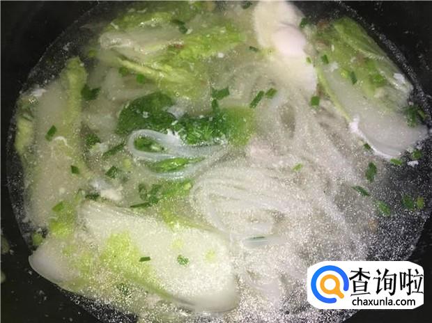 最后加入少许盐调味,一碗香喷喷的瘦肉鸡蛋粉条汤就做好了。