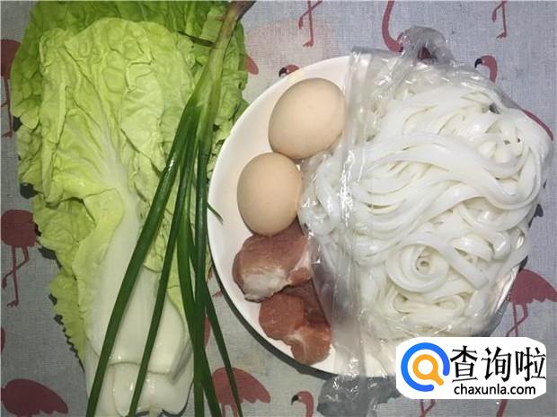 先把食材准备好:河粉适量、瘦肉适量、鸡蛋2颗、白菜一颗、葱两根。