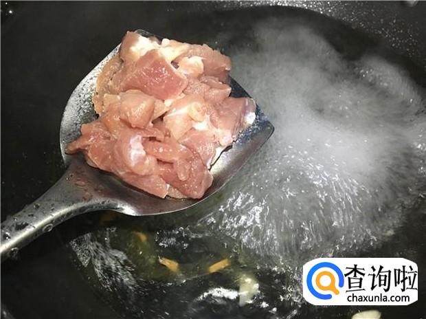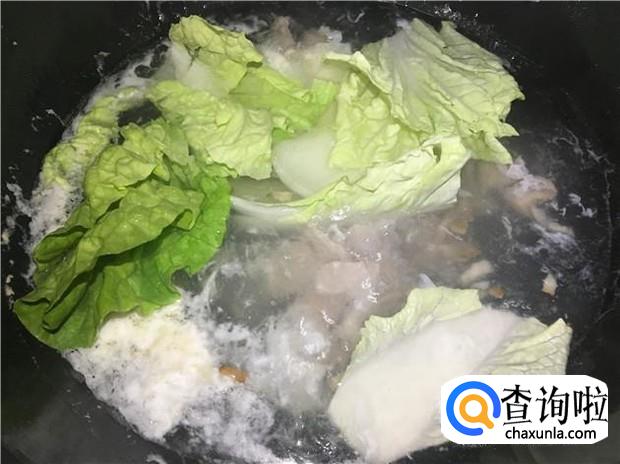 水煮开后,把瘦肉放下去,然后先把瘦肉煮熟,再放入青菜。
