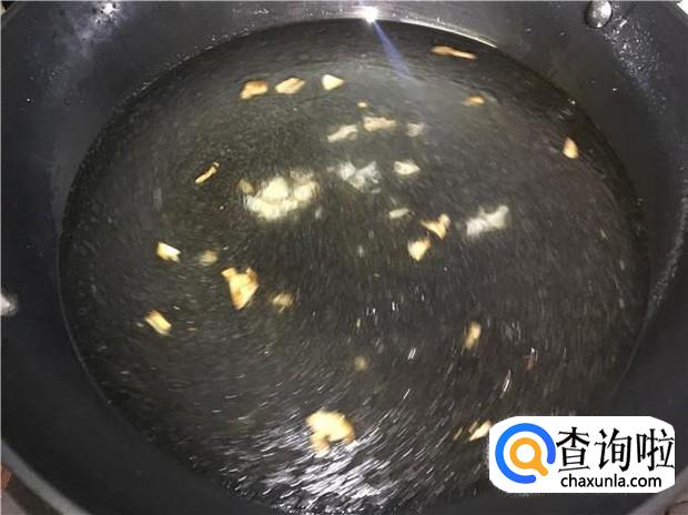 热锅下油,放入姜蒜煸香,然后加入4碗清水,大火煮开。