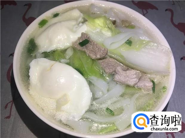 河粉、瘦肉、鸡蛋、青菜、葱、姜、蒜、花生油、盐