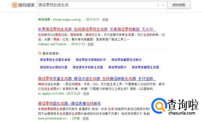 打开任意浏览器,在搜索框中输入“微信零钱在线生成”,然后选择一个制作截图的网站进入。