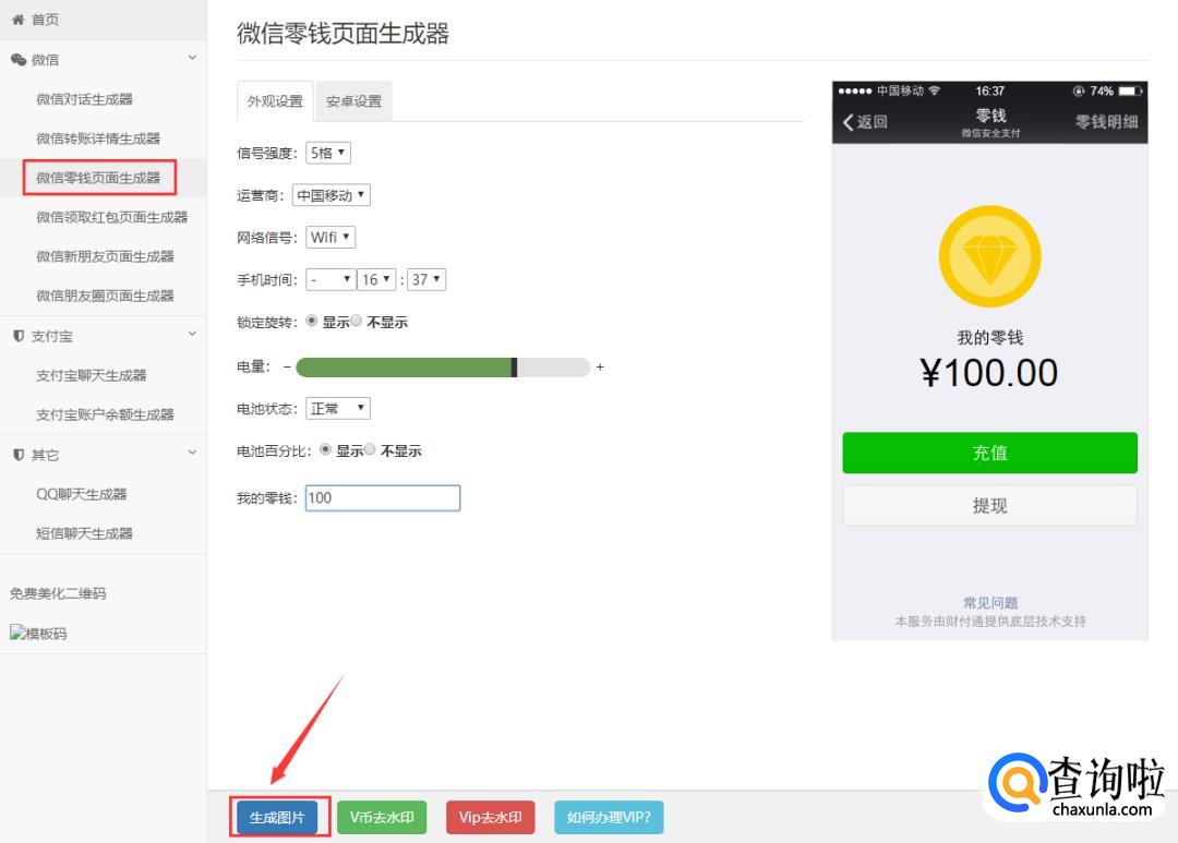 这里以制图网为例,在左侧功能栏中选择“微信零钱页面生成器”,然后在右侧进行外观设置,包括调节信号强度、运营商、网络信号、手机时间、电量和零钱金额,设置好之后点击下方的【生成图片】。