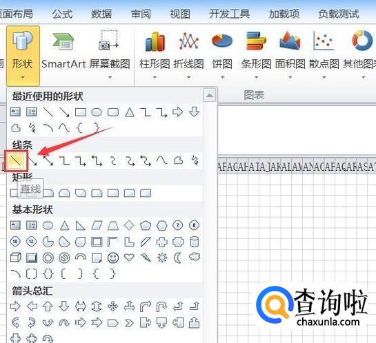 点击插入选项我们在其子级菜单里找到线条里的直线选项,如图所示: