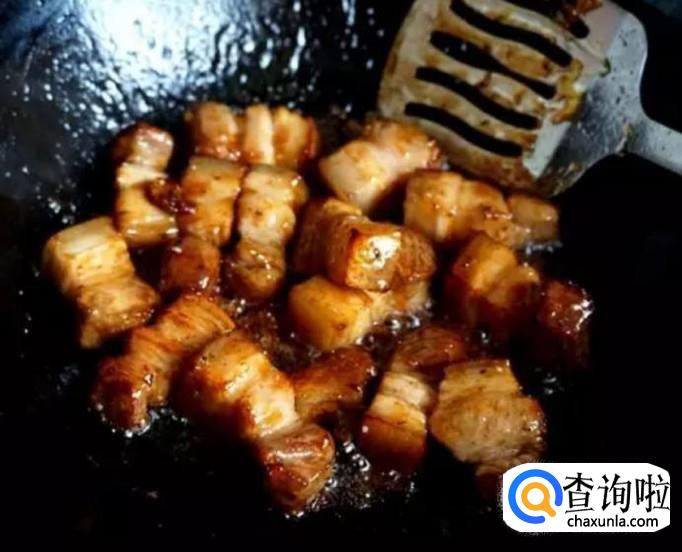 在油锅内倒入少许菜籽油,七成热后倒入冰糖炒至焦糖色,再倒入五花肉煸炒上色,直至金黄色。再放入拍好的姜块、八角、桂皮,然后盖上锅盖闷三到四分钟。