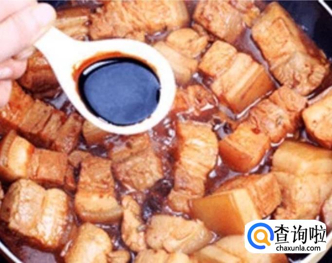 四分钟后,将肉翻炒倒入适量的生抽和老抽调色,再焖锅三分钟。