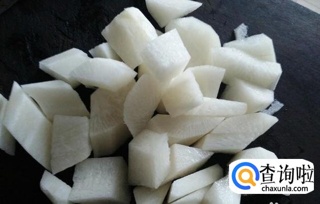 首先将五花肉在冷水中洗净,切成小块,放入沸水中焯六七分钟,捞出沥干,待用;白萝卜洗净滚刀切块,待用。