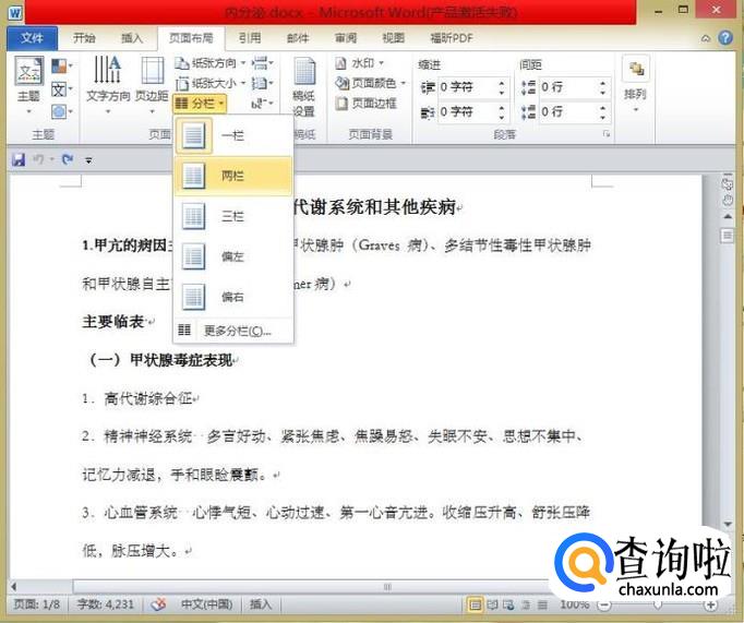 我们先分两栏,单击”两栏“(当然我们也可以分三栏)
