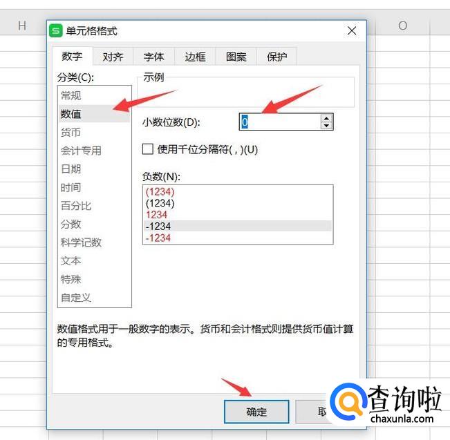 在设置中,选择数字下的数值类型,并将小数点位数调成0,点击确定
