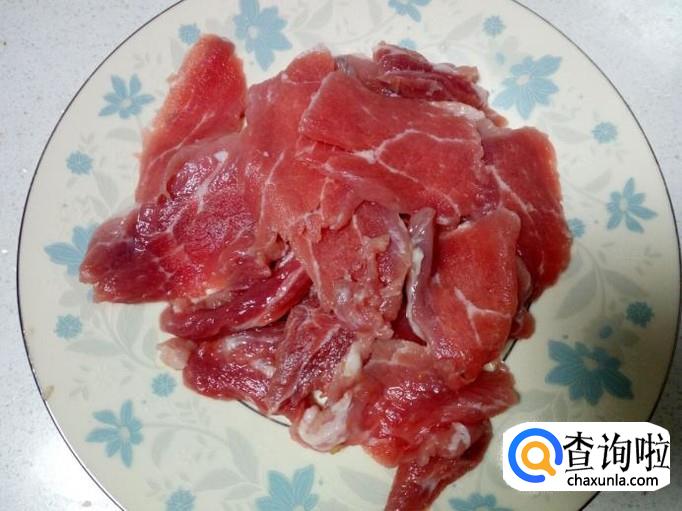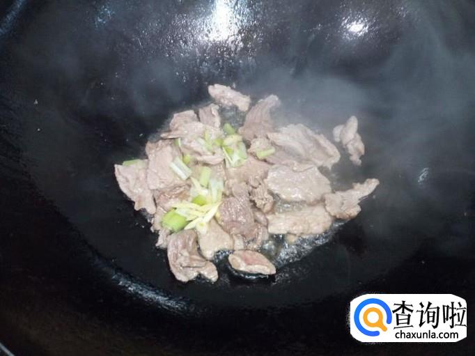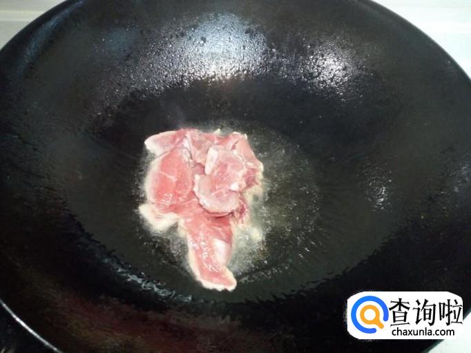 锅里放入油加热,油热后放入肉片,中火煸炒,煸炒至肉片下油,放入葱,姜。