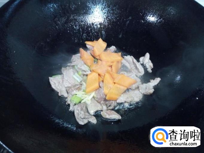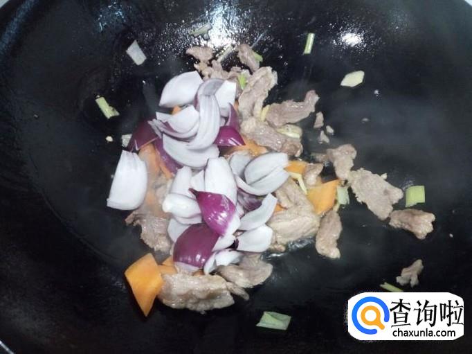 随即放入胡萝卜片煸炒至变软。放入圆葱煸炒出香味。
