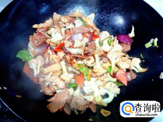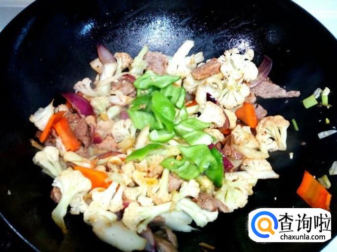 翻炒至有机菜花沾满料汁,放入青尖椒略翻炒一下,关火出勺。