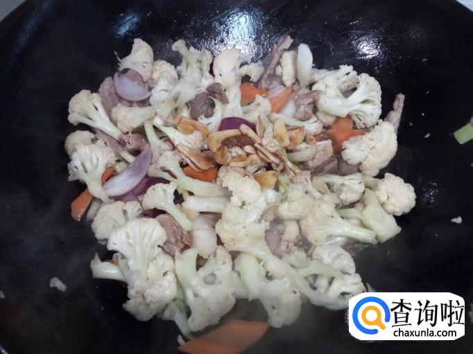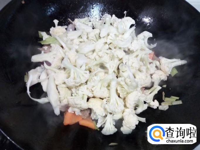 然后放入有机菜花煸炒,煸炒至有机菜花变软,放入调和好的料汁。