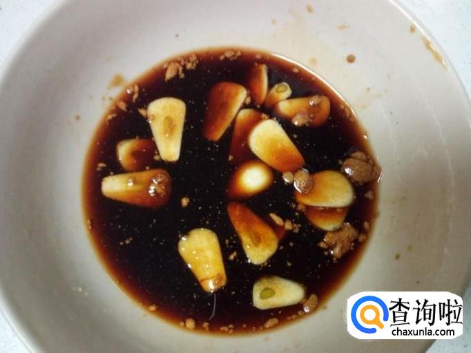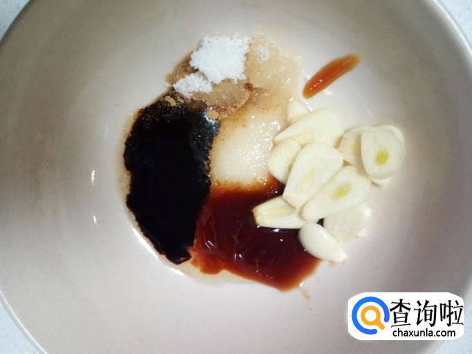 碗里放入盐,味精,五香粉,白糖,料酒,酱油,蚝油,蒜,兑少许水,调和成料汁。