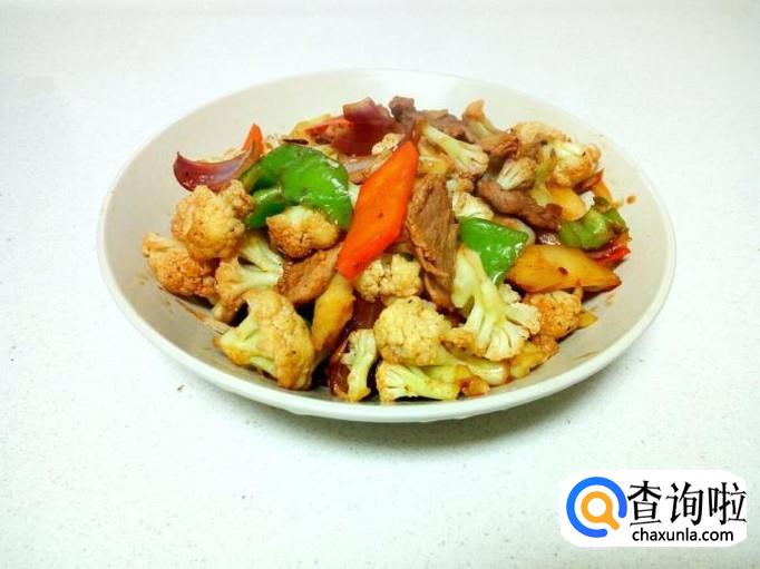 有机菜花 250克,猪肉 100克,圆葱 1个(小),青尖椒 半个,胡萝卜 适量。
