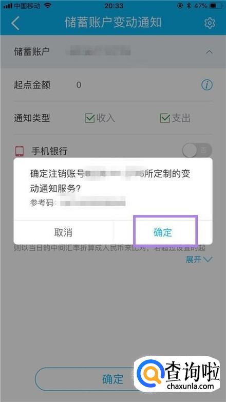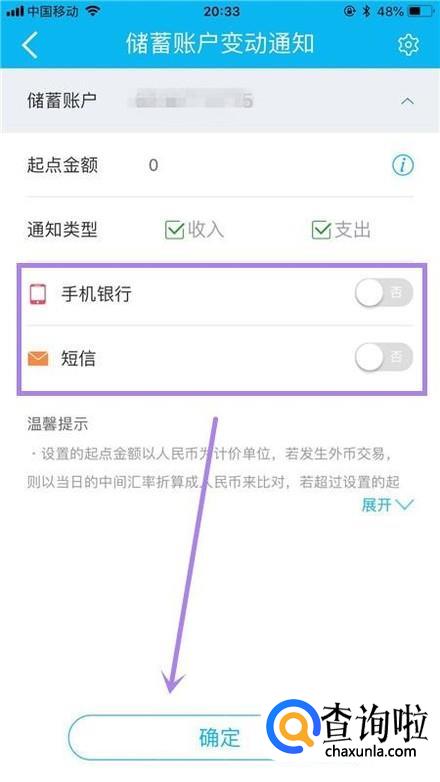 然后关闭手机银行和短信的开关并点击确定,如下图所示。