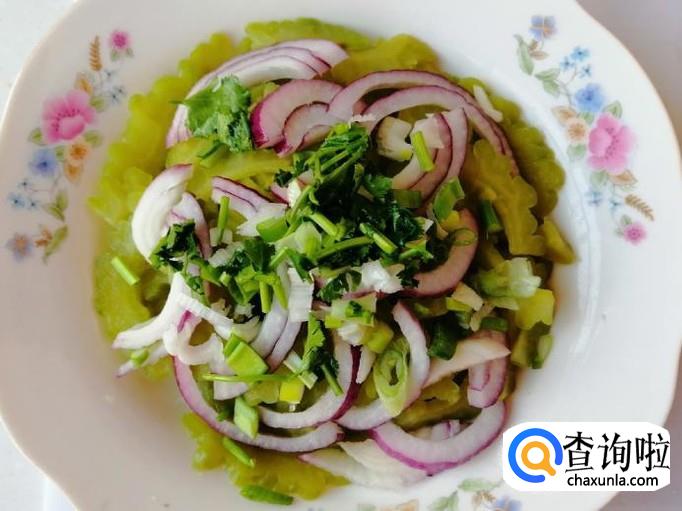 把烫好的苦瓜盘中,加入适量切好的圆葱,加入葱花,再加入切好的香菜,都摆放好待用。