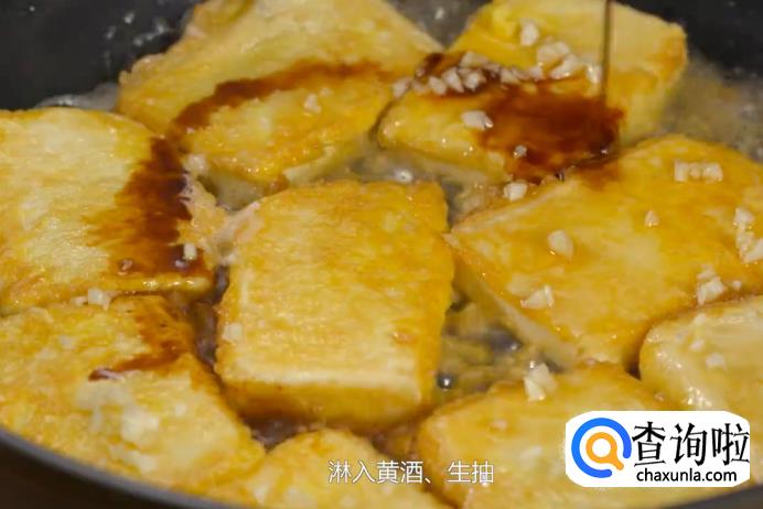 转中火,将豆腐的两面煎成金黄色后,撒蒜末爆出香味,再淋入黄酒、生抽。