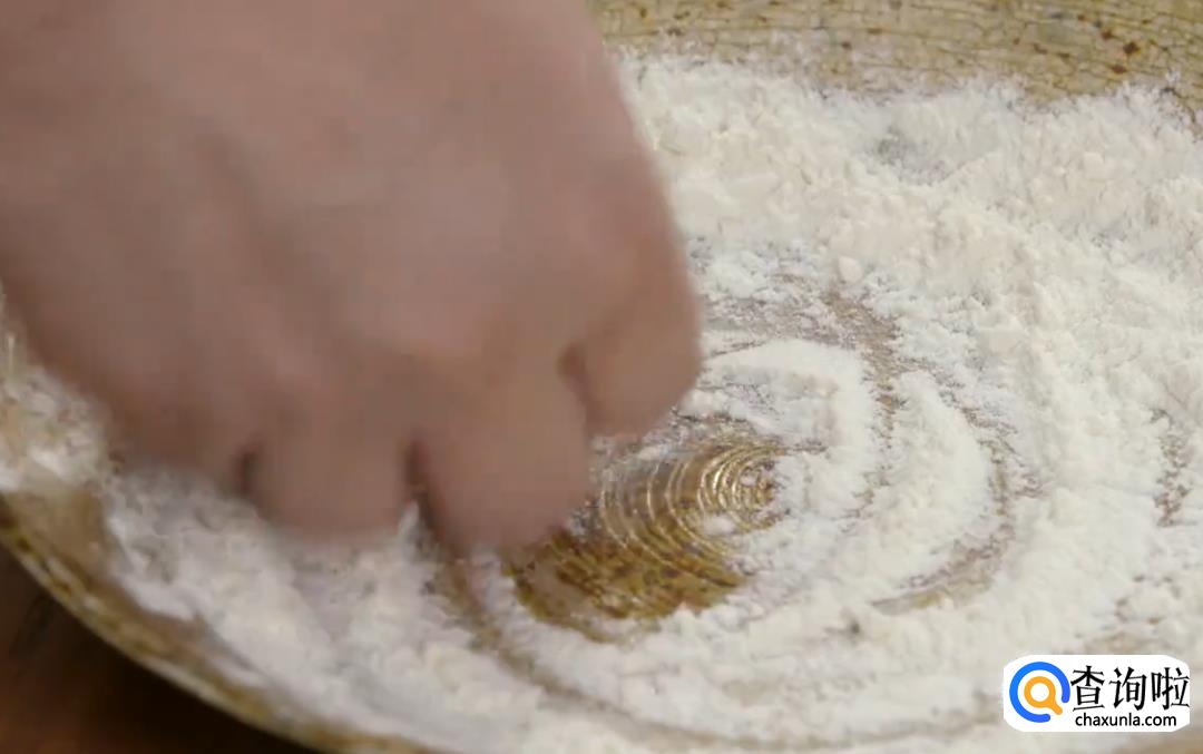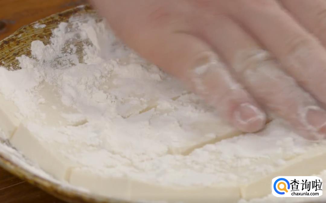 另取一个盘子,在盘底铺一层面粉后放上切好的豆腐,再撒一层面粉,拍匀。