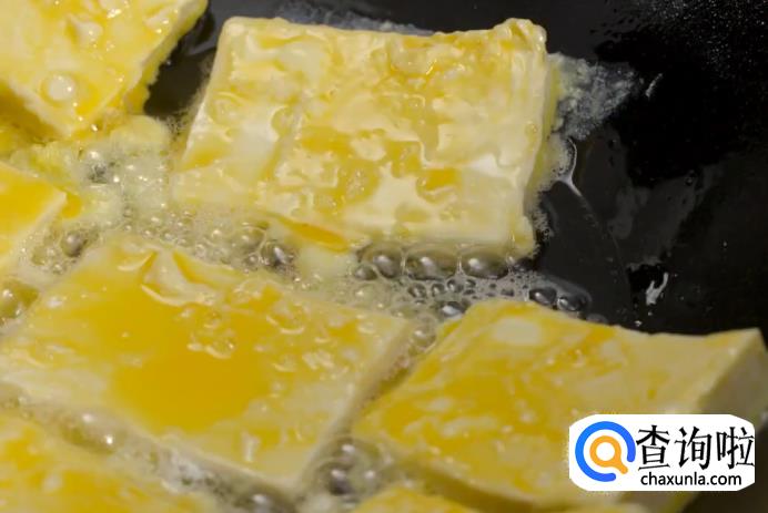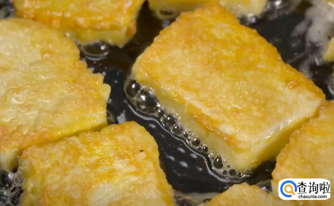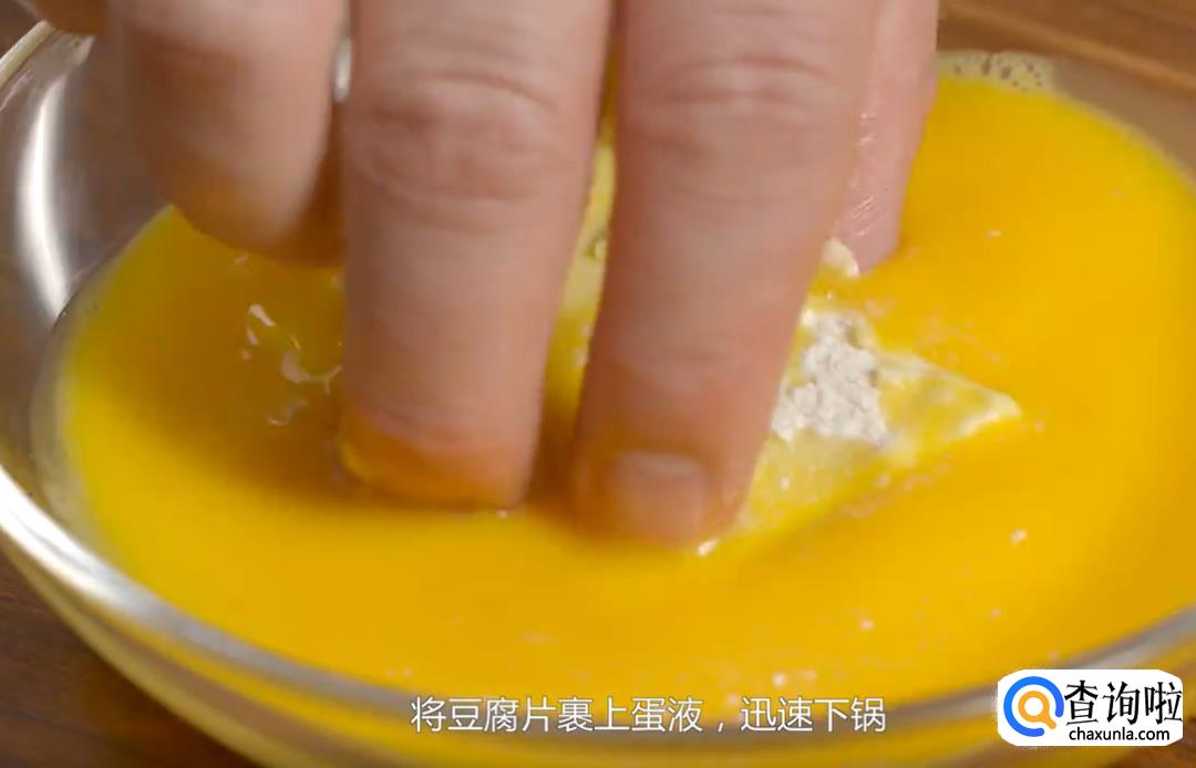 热锅起油,大火烧热后转小火,将豆腐片裹上蛋液,迅速下锅。