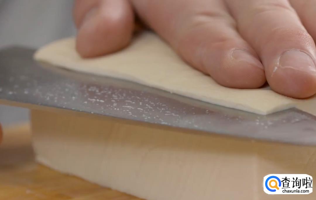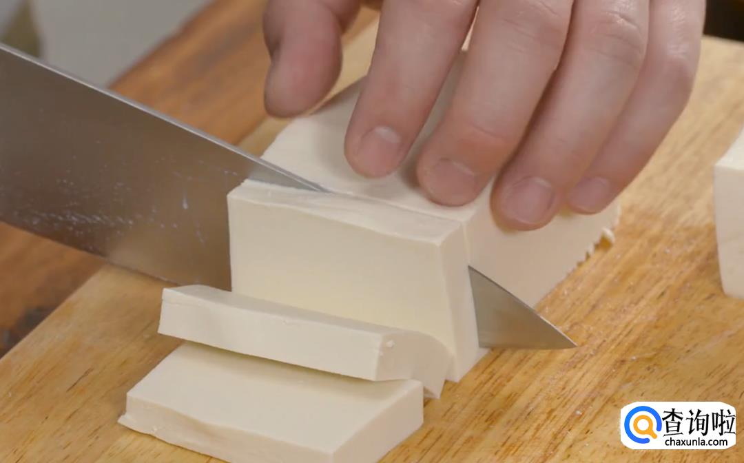 切去板豆腐(老豆腐)上下两面的硬皮,再切成一公分左右的厚片,待用。